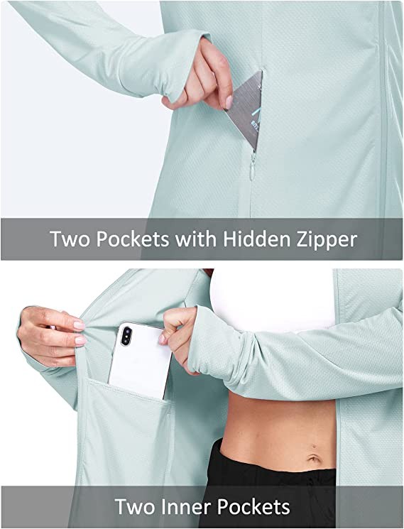 2 Side Hidden Zipper Pockets: Women's outdoor sun shirts jackets have 2 side zipper pockets and 2 inner pockets. The pocket is large, half of the space already can hold a 6.7" phone.