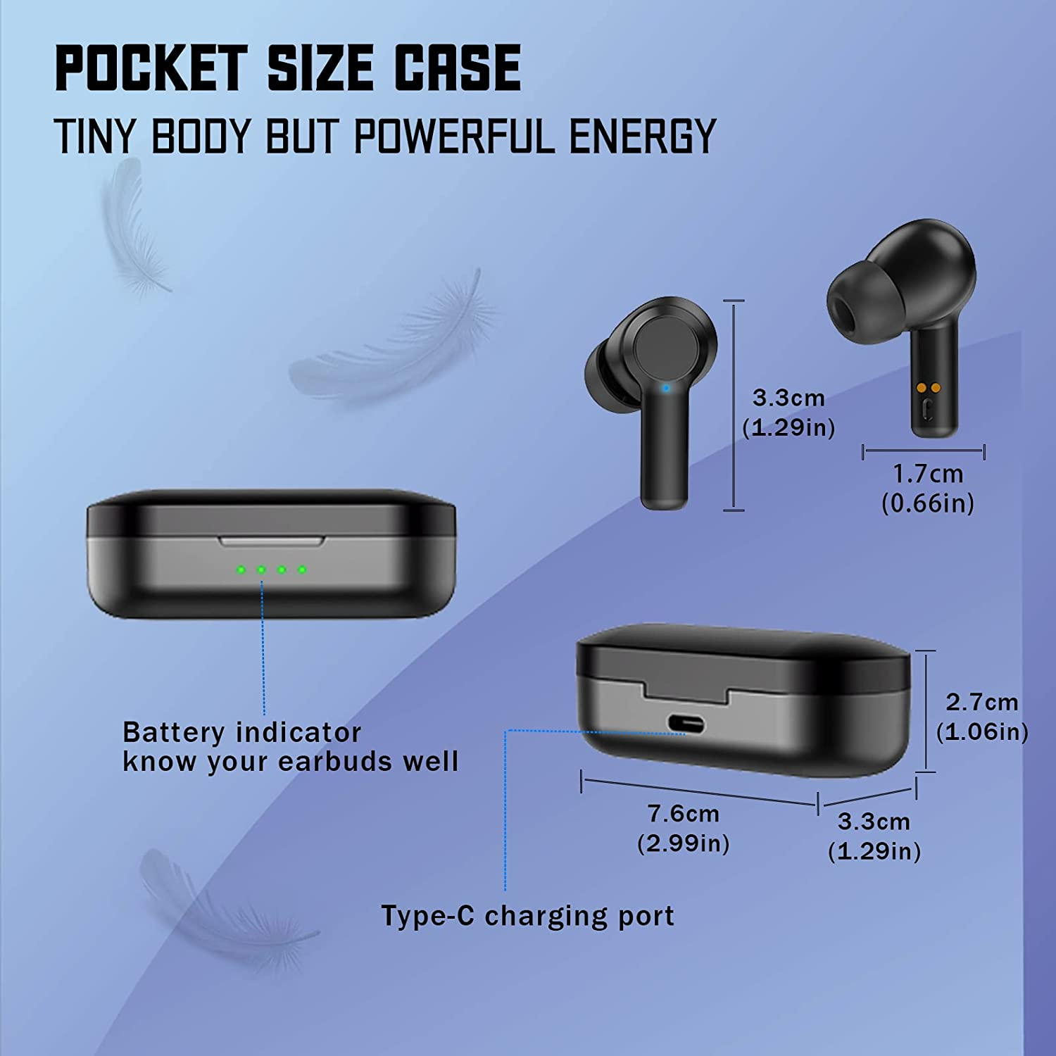 • Other Features: The bluetooth ear buds is IPX7 Waterproof, don’t fear about splash and sweat; the bluetooth ear buds will pair automatically when picked up; the ear pods use easy-operation touch button; the case has a widely compatible Type-C fast charging port; the ear buds support native voice assistant like siri; the package comes with 3 ear caps and more for you to discover.